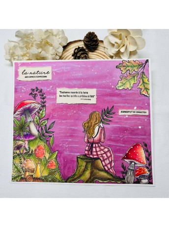 Planche de 15 tampons transparent sur le thème de la balade en forêt avec une fille sur un tronc d'arbre