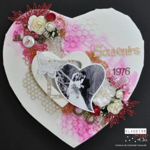 Un canevas en forme de cœur, une forme cœur en carton, des fleurs.