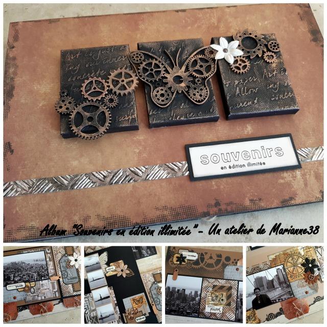 Un petit peu de patouille et quelques techniques Mixed Media au programme de cet atelier ! L’album « Souvenirs en édition illimitée » est un album de grand format (20 x 30 cm), réalisé avec des papiers Kaisercraft de la collection « Documented ». Il contient 18 photos. Le style est « vintage-industriel » : engrenages, métal cuivré et effet rouillé ponctuent la décoration de l’album. J’ai choisi d’y mettre des photos de New York, mais vous l’adapterez facilement au thème de votre choix. Au cours de cet atelier, nous utiliserons les mousses Nuvo pour créer des effets cuivrés, et nous jouerons avec les encres Distress et des poudres à embosser pour réaliser de la fausse rouille plus vraie que nature.