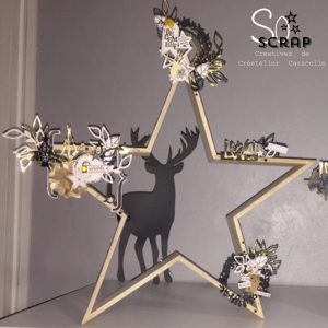 J’ai commencé par travailler par la plus grande étoile en mettant une silhouette de cerf découpée avec la machine de coupe (La Portait de Silhouette), je la positionne derrière pour donner un peu de profondeur .