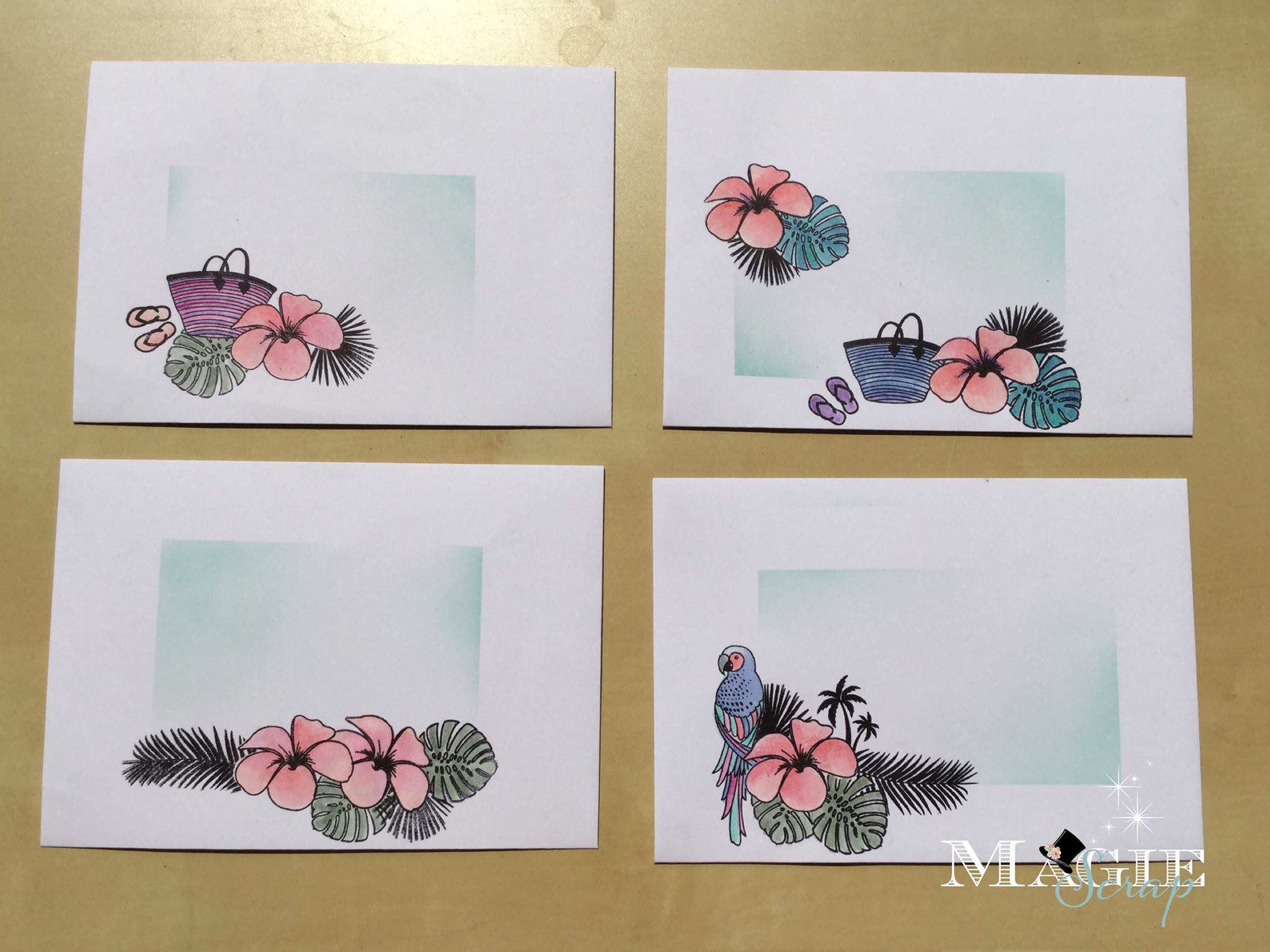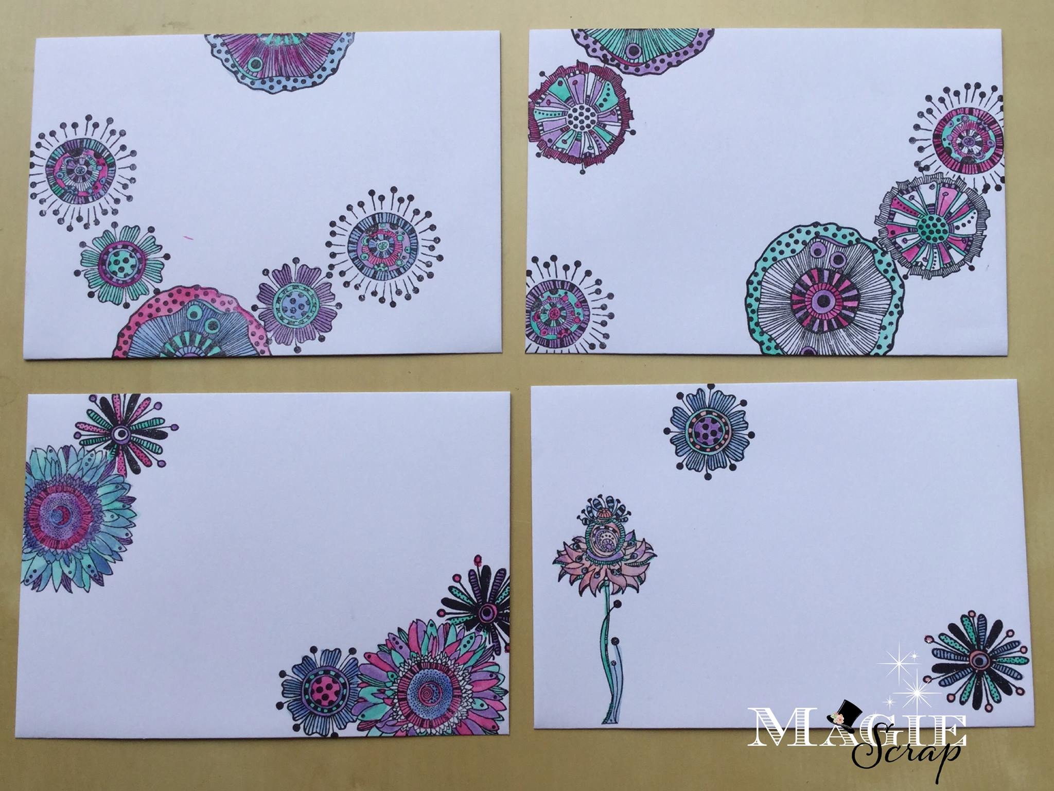 Moi j’ai opté pour les enveloppes décorées avec les tampons Carabelle et les tampons Florilège.