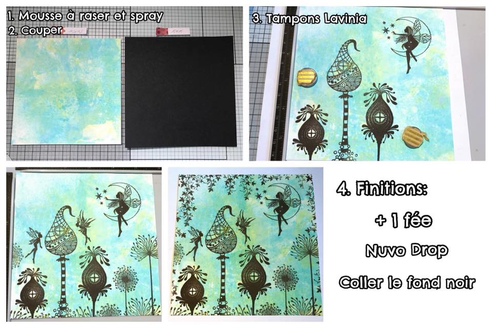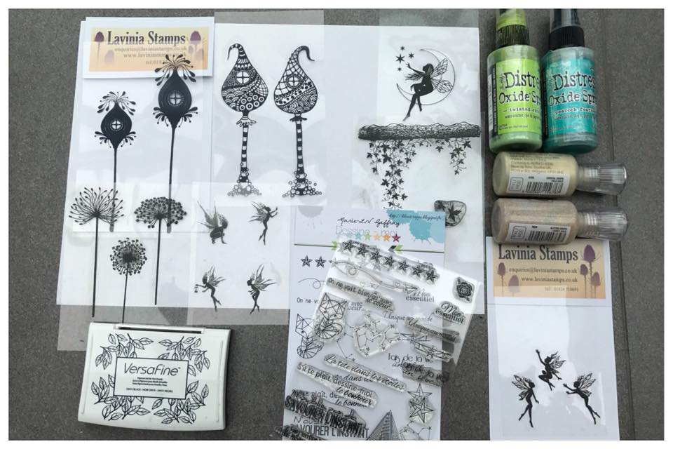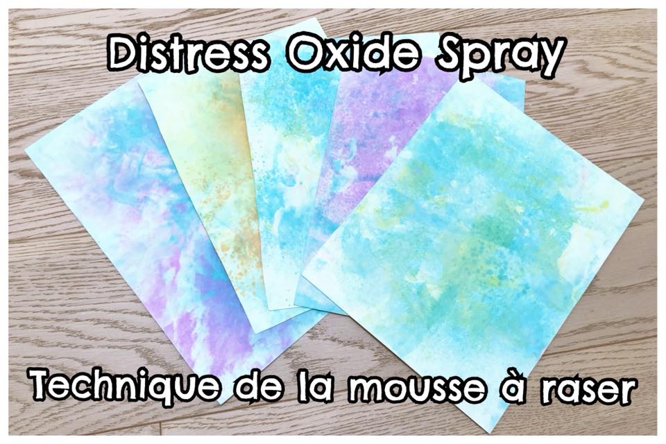 J’ai utilisé les Distress Oxide Spray avec la technique de la mousse à raser (plusieurs vidéos sur le net).