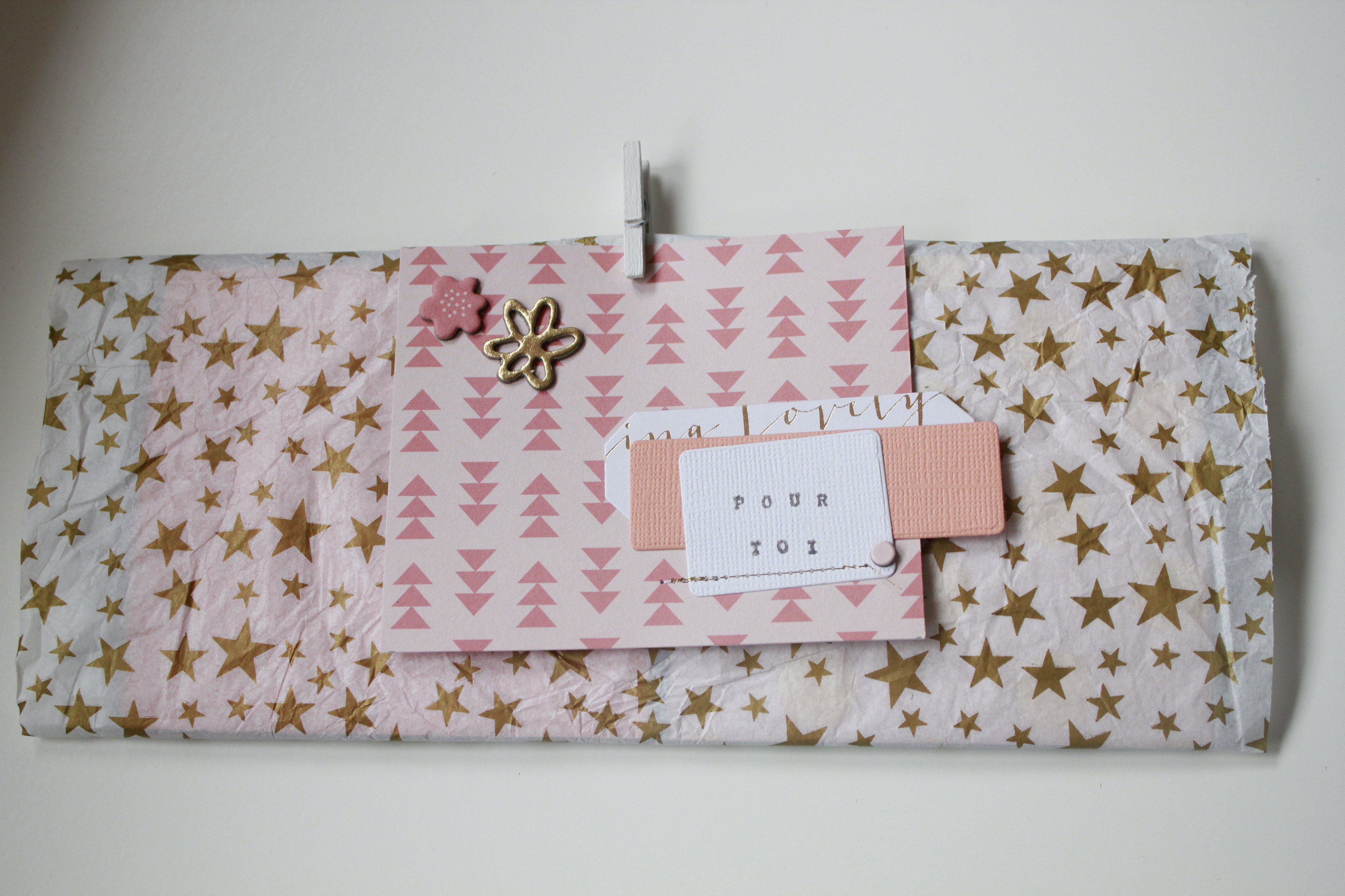 Une fois décorée, la pochette est pliée en trois et emballée dans du papier de soie (de récup), et elle a finalisé le tout avec une étiquette maison.