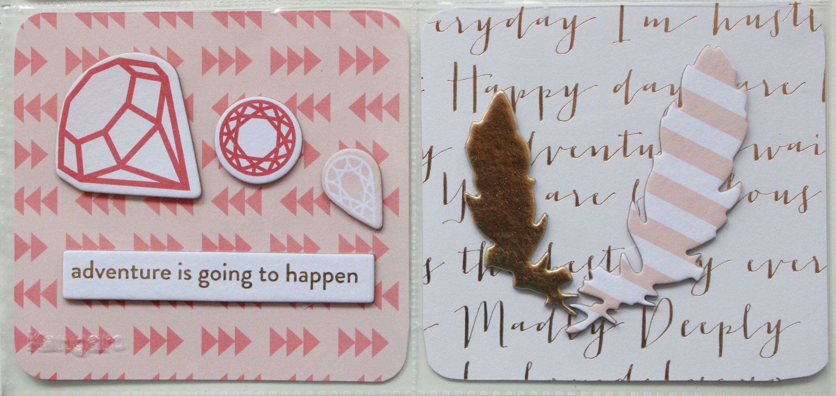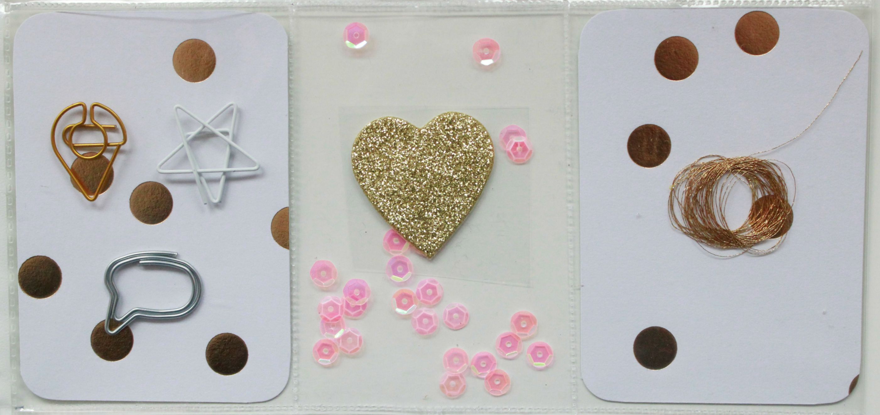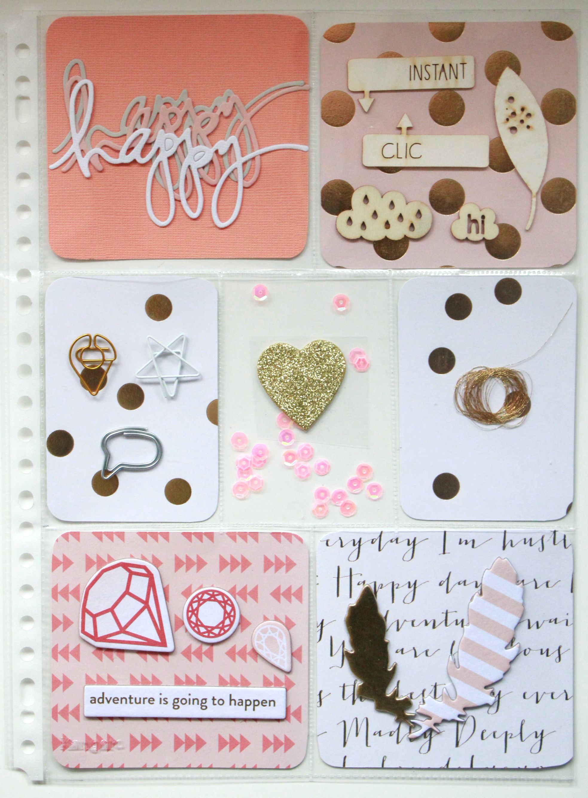 Elle a inséré des découpes de dies, des éléments en bois, quelques trombones, des sequins, du fil doré et des chipboard qui proviennent aussi du Kit On Trend.