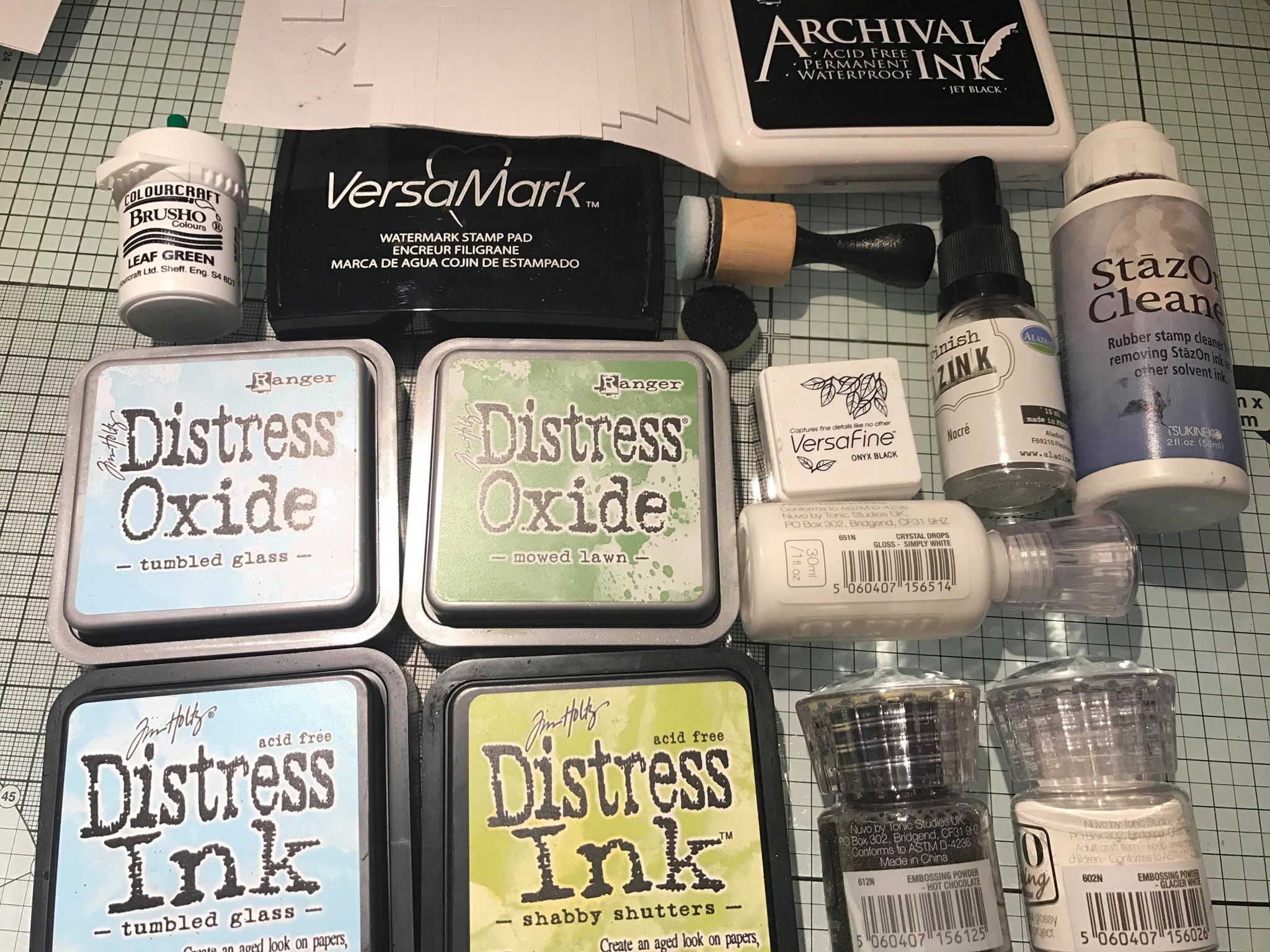 Brusho, Distress ink et oxyde, versafine, embossage…..