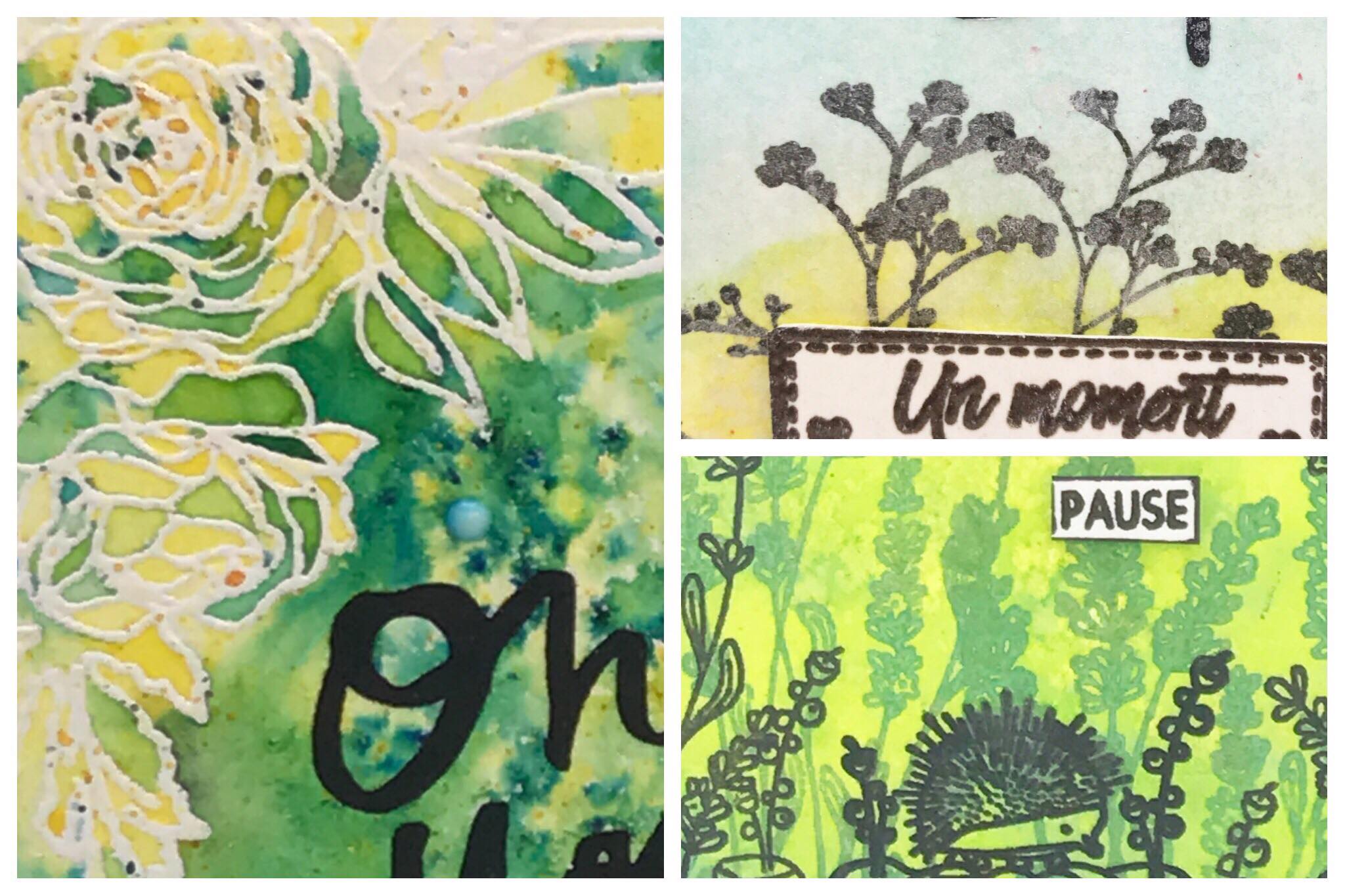 un petit spray d’eau, un tapis téflon, un fin pinceau, versafine noir, des tampons natures et textes de petites tailles (ceux de l’atelier seront mis à votre disposition)