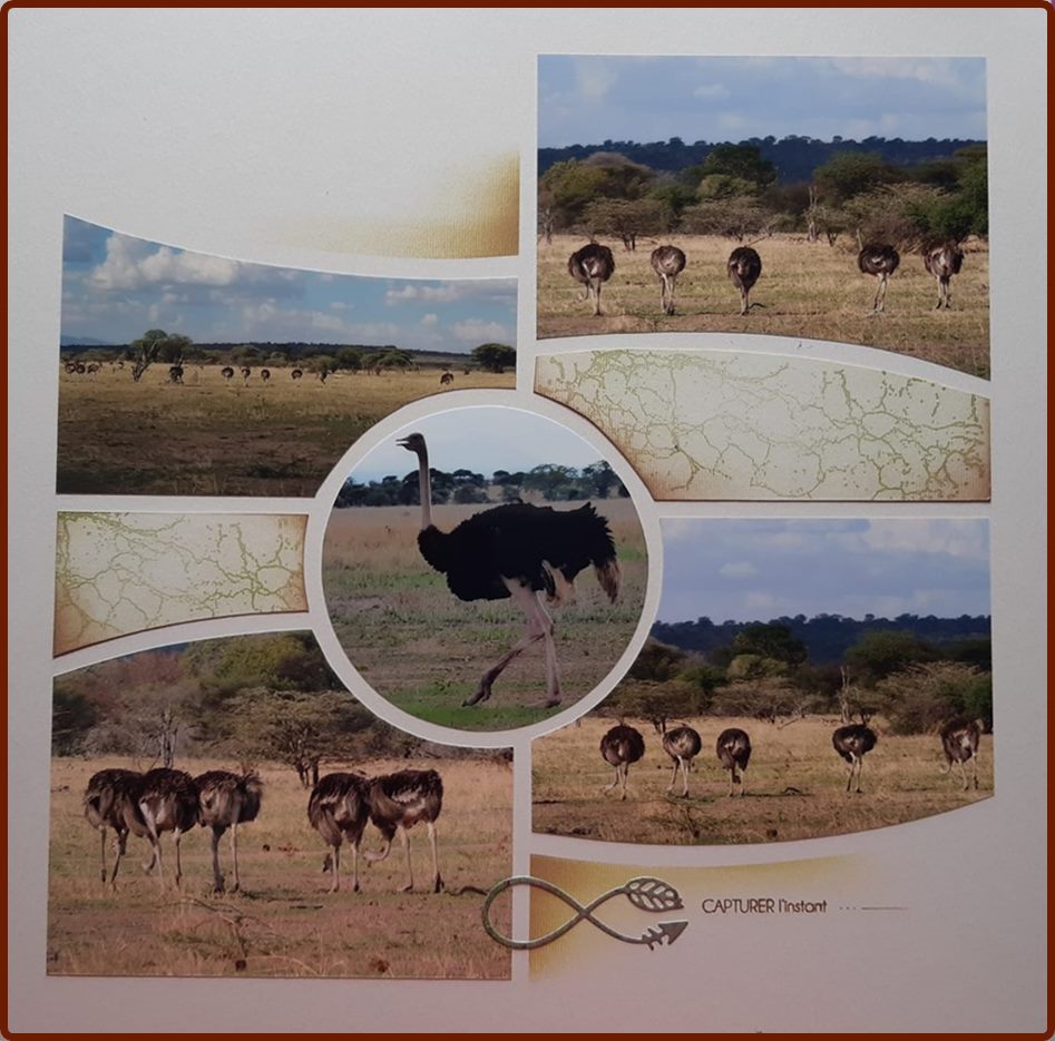 J’ai utilisé 5 photos, du papier de la même couleur que ma page, j’y ai mis un tampon de fond tamponné à la versamark, pour faire ressortir mon tampon, j’ai mis de la craie verte et ensuite dans les angles de l’encre Oxide Walnut Stain.